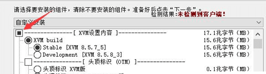 4. 由于国服无法使用M,XVM设置内容可直接跳过。在安装过程中,建议先取消所有默认勾选的内容,自行选择所需的插件。在模组选择界面中,双击XVM设置内容前的方框以取消勾选,然后选择XVM build中的Stable或Development(此项必须勾选,否则将导致界面无限卡住)。
