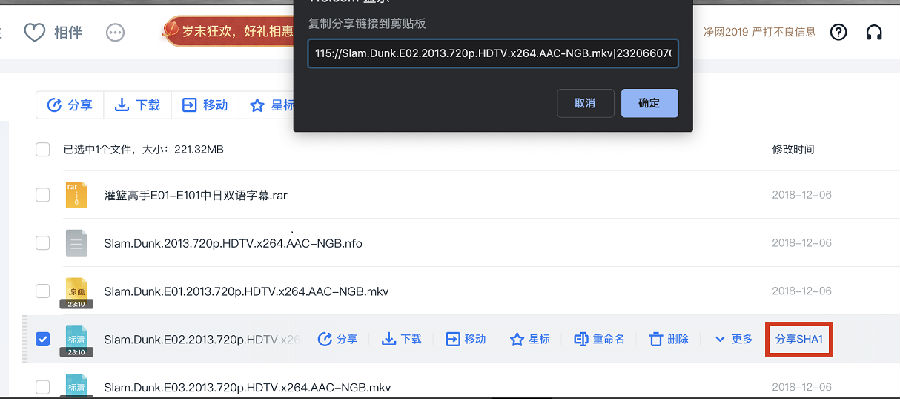 1) 登录115,选择你需要分享的文件或文件夹,发现会多了个分享SHA1的功能,点击后会自动生成转存链接。