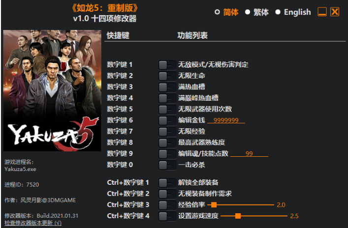 如龙5重制版十四项修改器是为喜欢该游戏的玩家带来的最新的游戏修改辅助工具,能够为玩家提供无限生命、无限金钱、无限经验等多项功能,有需要的玩家不要错过了,赶快来下载吧!