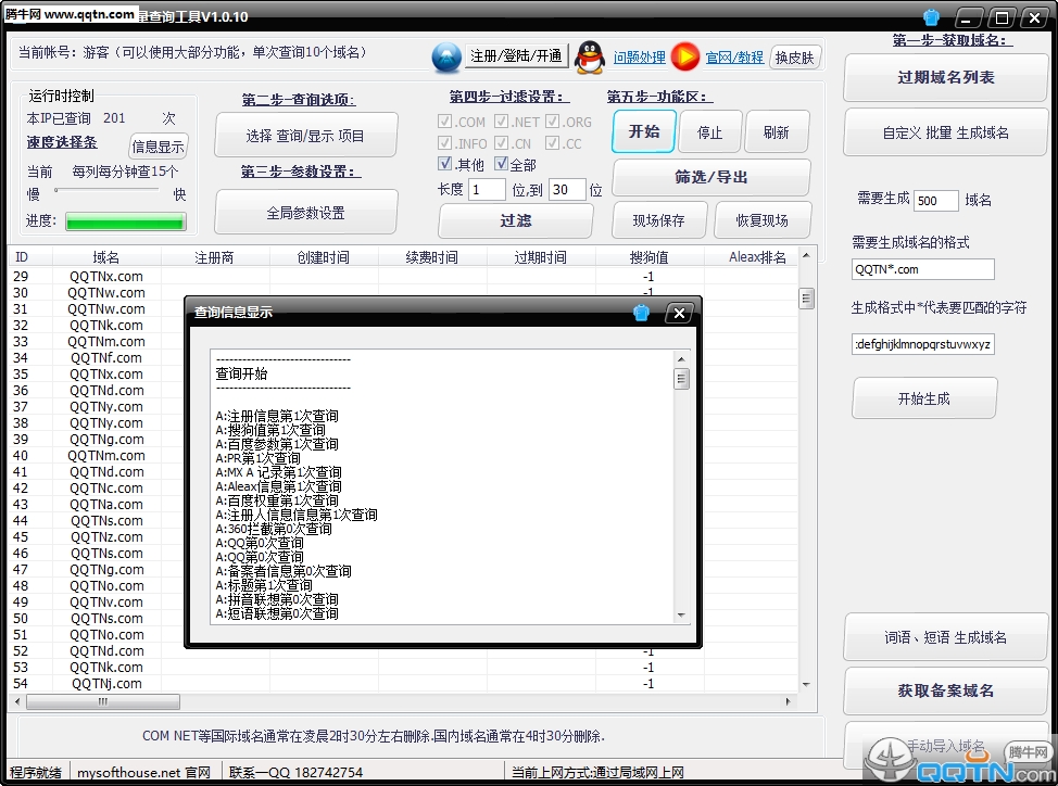 软件屋域名信息批量查询工具查询批量查询高PR过期域名,批量查询备案未注册域名,批量查询过期高流量域名,批量验证域名360是否拦截,批量查询高外链域名,查询域名三年数据,是您查询域名综合信息的利器。