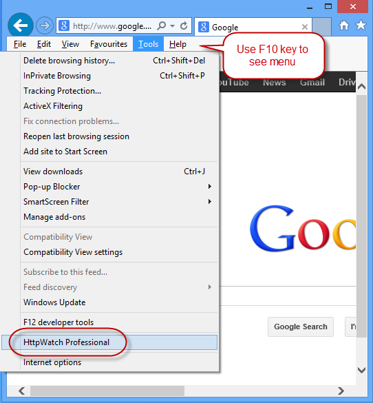 在工具菜单上使用HttpWatch的菜单项。在IE和Firefox的更新版本,你可能需要按F10键显示菜单: