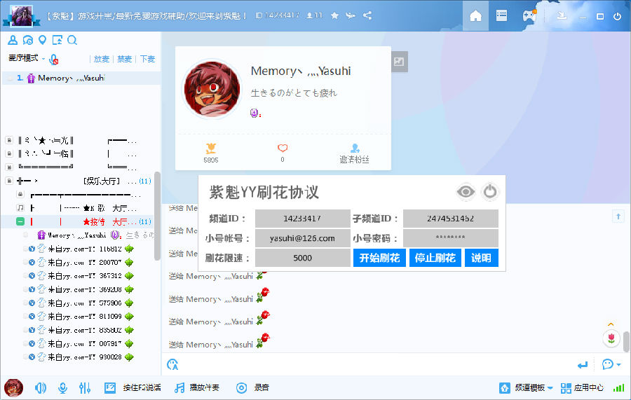 紫魁最新YY小号刷花协议工具是一款免费的YY刷花软件,这款软件支持用YY小号进行刷花,软件操作,输入频道ID和子频道ID,填写YY小号和密码,设置好刷花限速之后就能开始刷花了,效果非常赞,需要的朋友快来免费下载使用吧!