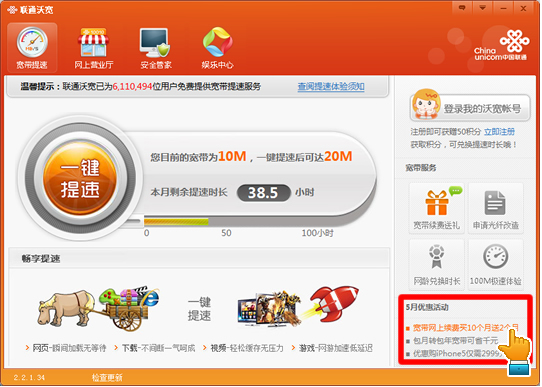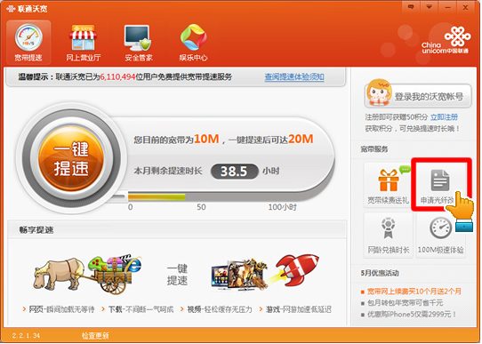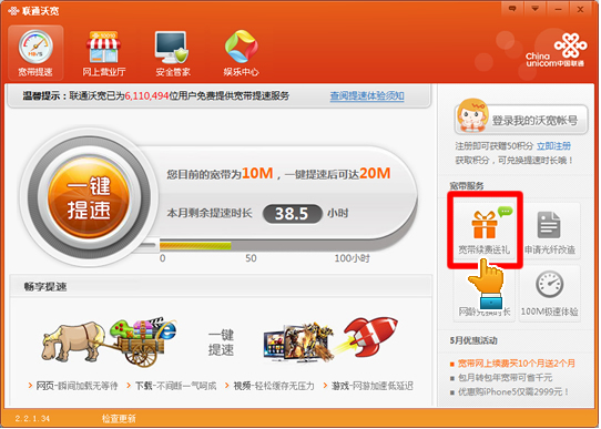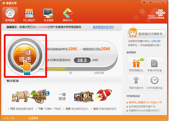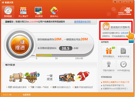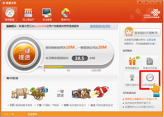 联通光纤接入宽带用户可以通过参与微博互动有奖活动,获取激活码。点击客户端右侧界面"100M极速体验"图标,成功使用激活码即可享受100M宽带。