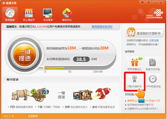 宽带服务版块中联通宽带用户可以通过点击"网龄兑换时长"图标进行兑换免费宽带提速时长。