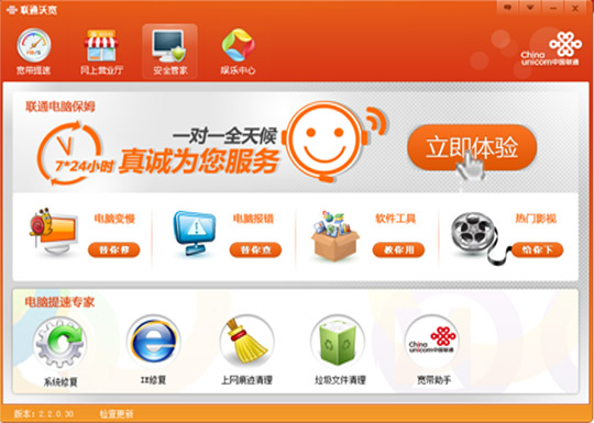 该版块主要为北京联通用户在网络安全方面提供服务;当用户的电脑出现开机慢、运行慢、网页打不开、各种软件(驱动)的安装、卸载问题;系统不稳定、电脑中毒、系统故障、主页被篡改、CPU占用100%、桌面出现无法删除图标等等问题时,请点击"立即体验"按钮,即可打开"联通电脑保姆"工程师24小时一对一个性化服务;或通过点击"电脑提速专家"模块中的"系统修复""IE修复""上网痕迹清理""垃圾""宽带助手"来为您的电脑保驾护航。