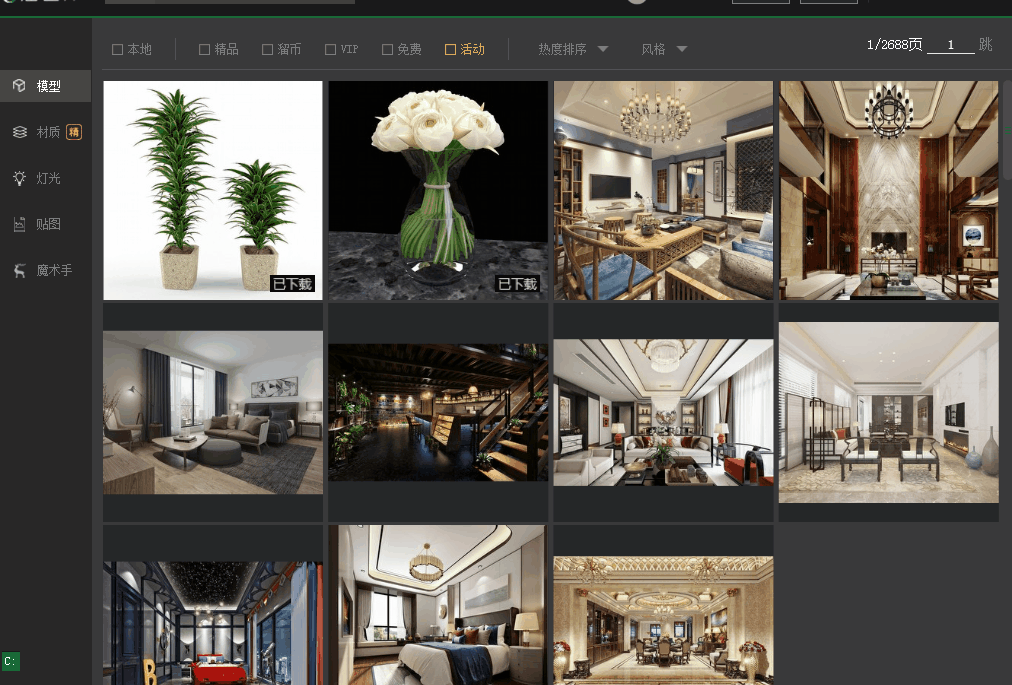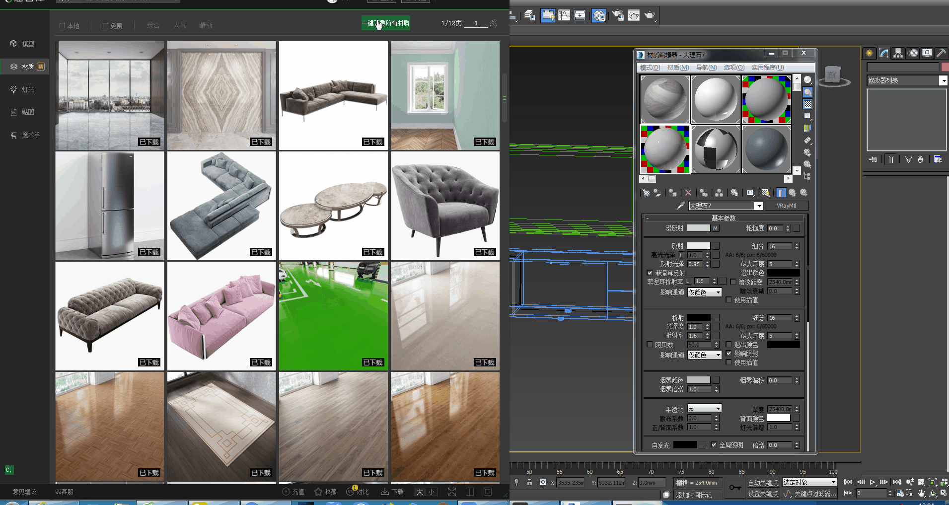 选择材质可以以一键下载所有材质,非常的方便,材质也是可以一键拖拽至3dmax里面使用。 如图一十一。