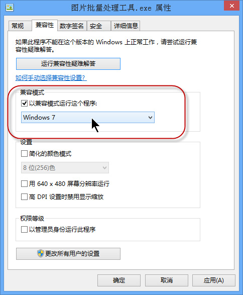 若您的系统为Windows 8及以上版本,请在启动前右键点击[图片批量处理工具.exe]文件,选择[属性],进入[兼容性]选项,以兼容模式运行该程序:Windows 7。