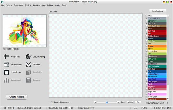 Brickaizer会记忆您最后的设置及最喜爱的项目,方便您随时恢复砖头马赛克的创作。砖块镶嵌过程交互性强,操作简便,所有输出均为可读及可打印的格式,例如位图及Excel电子表格,包含数量、成本及位置/方位数据。