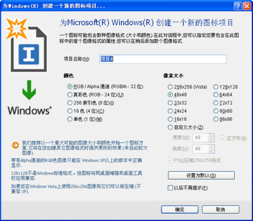 在Axialis IconWorkshop中选择“新建”或按Ctrl+N以创建新的图标项目,可以选择Windows图标或Macintosh图标类型。选定项目类型后,接下来确认项目名称、颜色和像素大小等设置。
