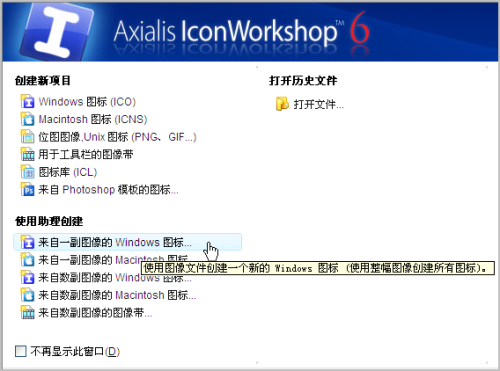 Axialis IconWorkshop能够根据不同格式的图像文件生成图标。打开文件或按Ctrl+O选择一个图像文件,也可在库中选择图像文件,或在启动时选择“从图片新建”作为素材进行图标制作。