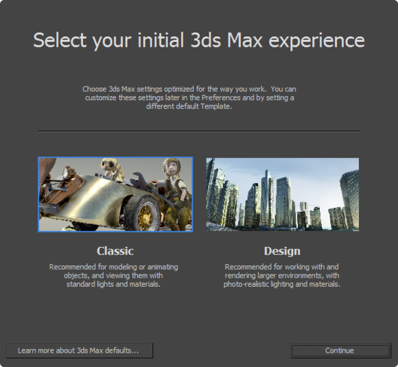 标准版max跟Design版结合到一起,开始启动时选择Classic或Design进入不同版本,我没用过Design版,所以选Classic,Continue继续