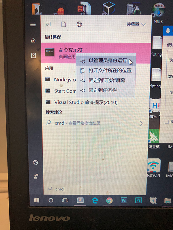 4. 开始->输入cmd->找到 命令行提示符 程序 -> 右键 -> 以管理员身份运行