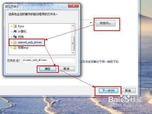 点击“浏览”按钮,在打开的文件夹选择对话框中选择刚刚解压之后的小米驱动程序文件夹,然后点击“确定”,再次点击“下一步”按钮开始安装小米手机驱动。
