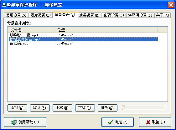 在“金锋屏幕保护程序 - 屏幕设置”窗口的“背景音乐”页面中: