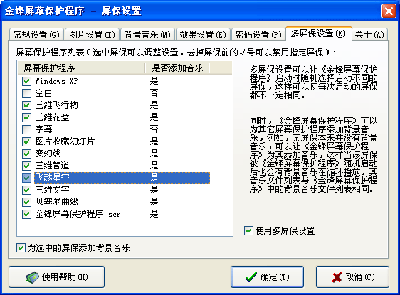 《金锋屏幕保护程序》可以设置多个屏幕保护程序被随机启动,而且还可以为其它屏幕保护程序添加背景音乐。