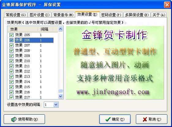 在“金锋屏幕保护程序 - 屏保设置”窗口中的“效果设置”页面中: