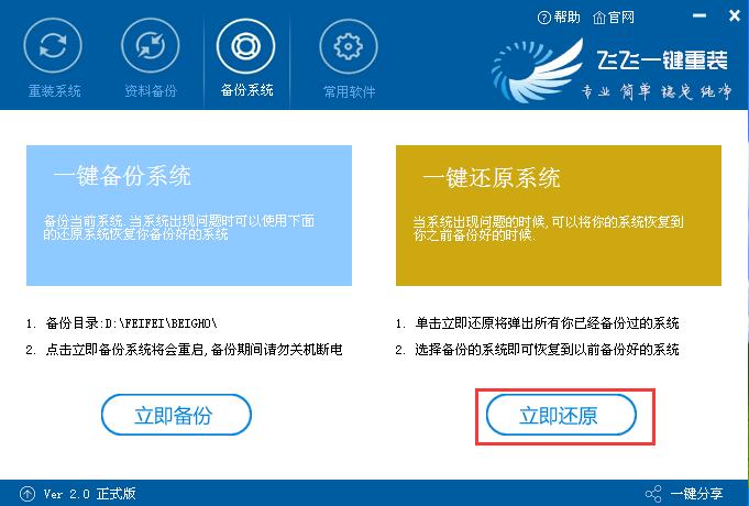 1、还是打开飞飞一键重装软件,然后在备份系统功能下,点击【立即还原系统】;