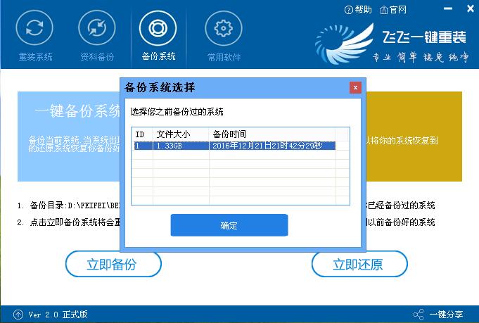 2、选择你要备份的镜像,飞飞一键重装可以备份多个系统备份并标记备份时间!按时间选择你要还原的系统备份,然后点击确定;