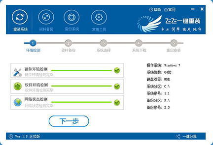 1、打开飞飞一键重装软件,然后点击【下一步】按钮;(注意:开始之前还是要关闭软件和安全软件哦)