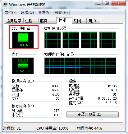接着我们可以打开系统的任务管理器,在性能列表中可以看到 CPU 的利用率会很高,如图所示: