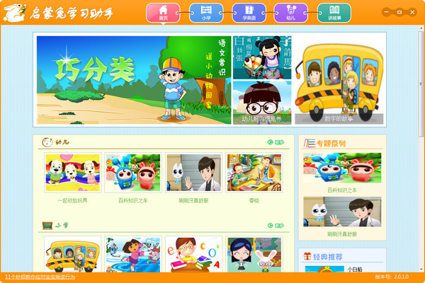 启蒙兔学习助手涵盖了儿歌、幼儿英语、拼音启蒙以及基础英语等多种启蒙教育内容,同时还收录了小学各科目的语文、数学、英语,奥数题目,以及十万个为什么等丰富的学习资源,是孩子们学习的得力助手。
