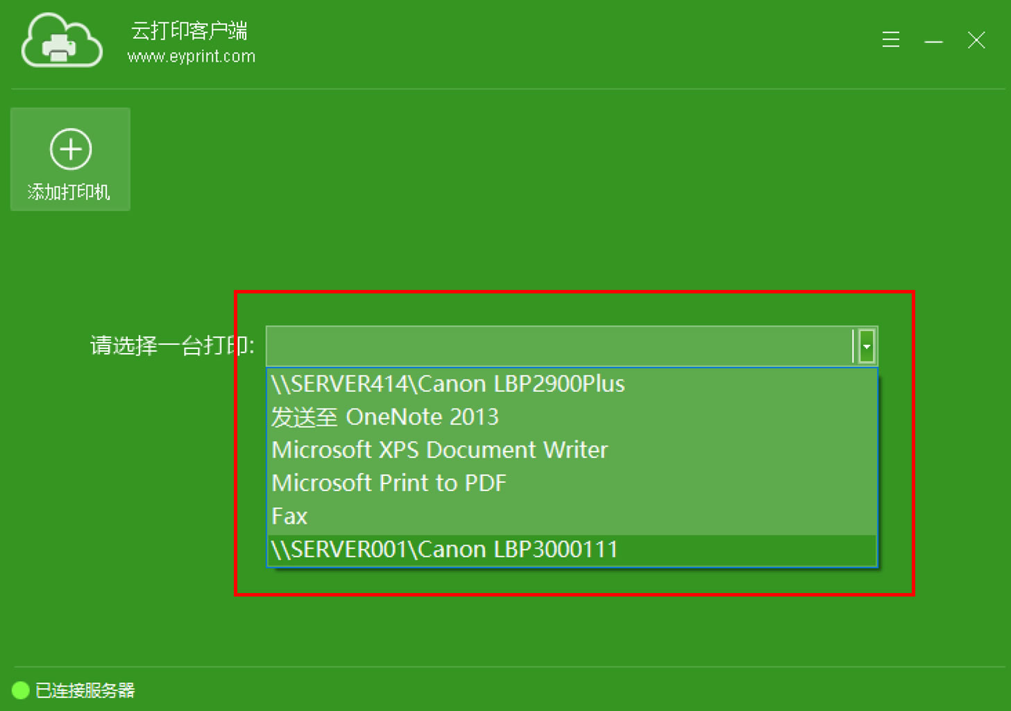 2. 从下拉框中选择本地打印机并添加到客户端(请确保打印机能够正常使用)