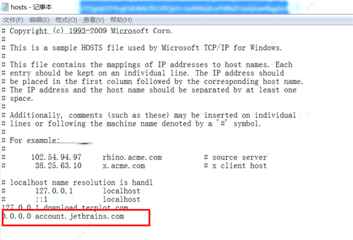 6、以管理员身份打开C:WindowsSystem32driversetc目录下的“hosts”文件,添加“0.0.0.0 account.jetbrains.com”至hosts文件中,然后保存并退出