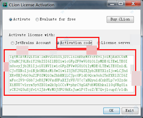 7、返回CLion 2018激活界面,选择“Activation code”,将注册码粘贴至下方的编辑框中,点击“OK”即可完成激活