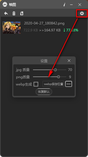 经过长期的反复调试与算法对比,柚图在画质、体积与速度三者之间,帮助您找到最佳平衡点,并能够在压缩的同时导出经过处理的webp图像。