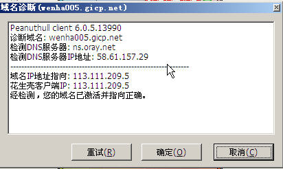 Address: 61.152.96.119 /该域名当前指向的IP地址,如果该IP地址与您当前的IP地址一致,则表明您的花生壳客户端已正常运行。