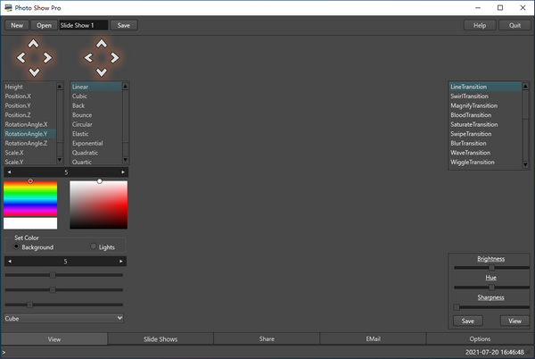可制作如溶解、褪色、3D旋转等过渡效果,调节照明,及为每张照片设置独特的背景颜色。