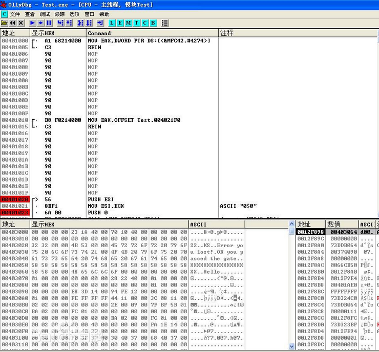 代码高亮:OllyDbg 的反汇编器可以高亮不同类型的指令(如:跳转、条件跳转、入栈、出栈、调用、返回、特殊的或是无效的指令)和不同的操作数(常规[general]、
