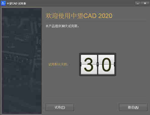 2.启动中望cad2020,弹出30天的试用界面
