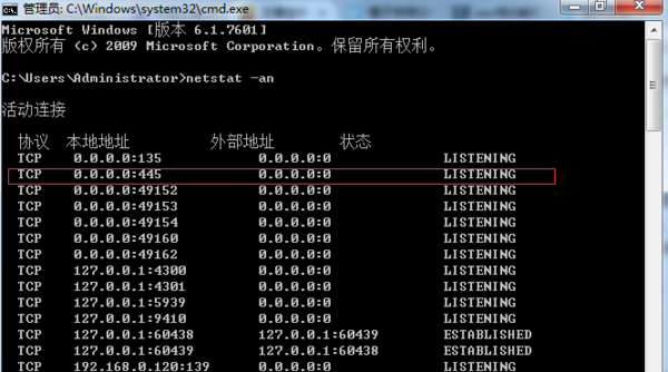 查看445端口是否开放并决定是否关停server服务 点击“开始”->“运行”->输入“cmd”->输入“netstat -an ”->回车->查看445端口状态 如果处于“listening”->暂时关停server服务: