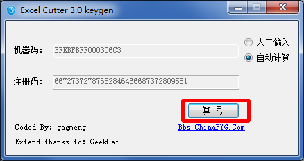 打开excelcutter.exe注册机,点击算号,即可自动获取注册码