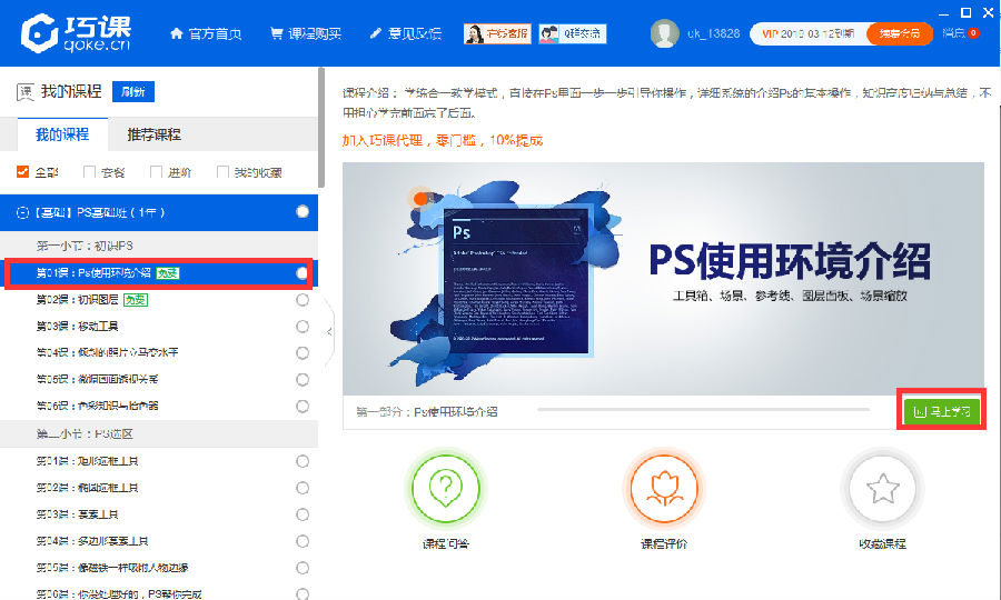 巧课是一款在线,传统的学习模式(视频、图文、课堂)是先学后练,即先看教程然后再到PS里面自己练习,巧课会直接在你本地电脑上的PS里面引导你一步一步去操作,学与练场景合一。