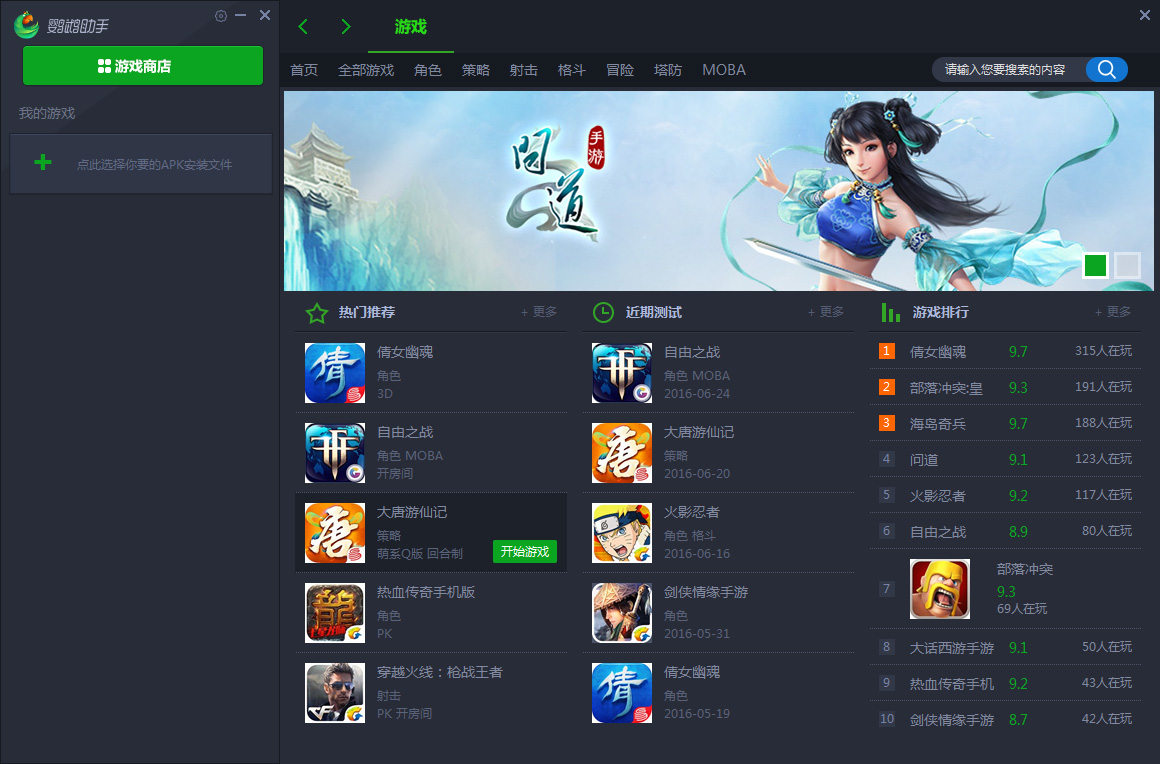 三、游戏安装,左侧大厅如果有你喜欢的游戏,将鼠标移动到该游戏附近,出现开始游戏按钮
