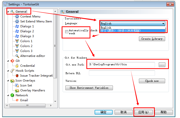 3. 选中General,在右边的 Language中选择中文. 不勾选自动的复选框,可能还需要指定 Git.exe 文件的路径,如 "D:DevlopProgramsGitbin". 完成后,点击应用,确定关闭对话框.(当然,你也可以继续使用英文)