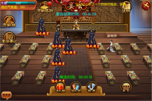 参与宴会的每一个环节,都能获得一定的宴会气氛值和个人贡献。个人贡献达到一定标准便可领取奖励。宴会氛围值越高,NPC前来送贺礼的机会越多,所有参与者均可领取。宴会结束时,会根据玩家的贡献排名进行奖励。宴会时间结束后将自动关闭,所有奖励将通过邮件发送。总之,宴会中将大量产出体力、精力、主角经验及大补丸。