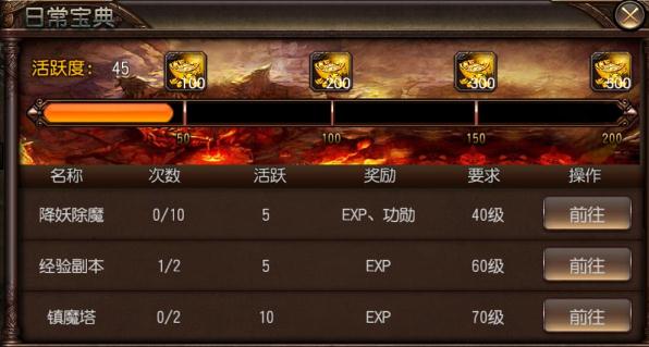 日常任务中包含了除魔、经验副本与镇魔塔等,都能为玩家带来丰厚的经验。降妖除魔每天可进行十次,经验副本和镇魔塔各可完成两次。