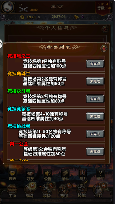 《魔天录》称号多达33种,每一种不同的称号都可以增加不同点数的四维(耐力、智力、力量、敏捷)属性,最高的四维属性可以加到300点