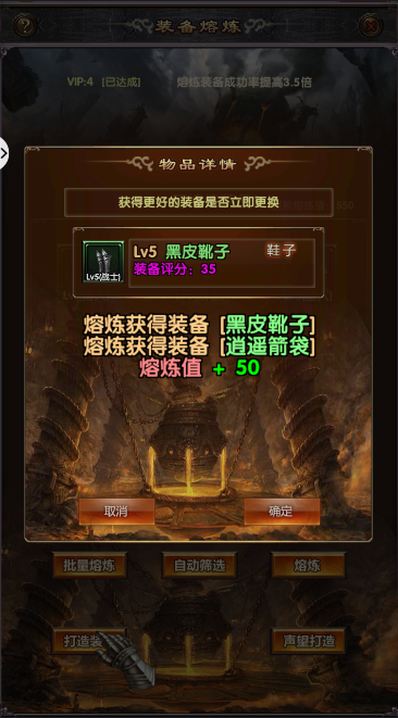 熔炼的时候注意千万不要拿低等级的和高等级的熔炼,不然熔炼出来的会有低等级装备,比如5个LV5级的和一个LV1级的装备,合出来的可能是LV1级的装备。每个品质相同的熔炼出高等级的几率更高!白色和白色的一起,绿色和绿色的一起,蓝色和蓝色的一起以此类推。