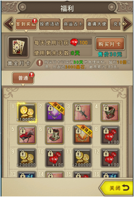 系统简介:每日签到,根据玩家登陆的天数给予玩家相应的奖励物品,玩家只要每天登陆游戏就可以获得签到奖励。奖励内容丰富实用,登陆2天就送紫色召唤石,登陆第3天送金色武器,登陆7天送金色召唤石,登陆第8天可以获得100晶石奖励。累积登陆30天一共可以获得1000晶石!