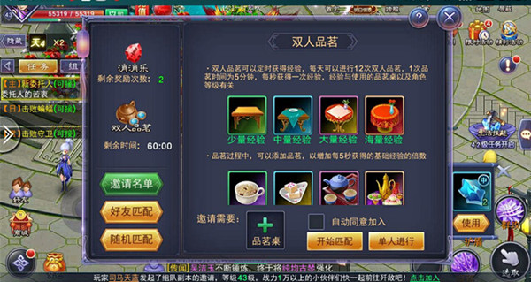 顾名思义,就是和你的小伙伴一起坐下来喝茶,既可以邀请好友,也可以随机匹配,如果你是个孤独患者,只好选择单人开始了。品茗的时长长达一个小时。此处小编建议还是和小伙伴一起玩啦,能够拿到更多经验。单人进行名茗,获得的经验是双人品茗经验额的0.7倍,也没有异性好友加成和公会加成。