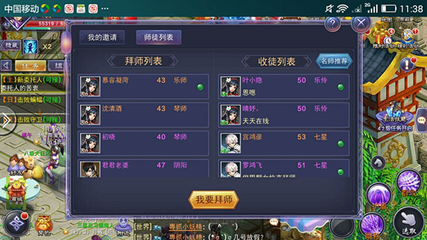等级在30-49之间的玩家可以拜等级50+的玩家为师,拜师成功,可以每天获得大量的经验和其他奖励,成为别人的师父可以获得桃李值、称号等奖励。学徒达到43、45、47、49级时,师父可以分别获得桃李值奖励。而当学徒达到50级就可以和师父进行出师挑战,如果胜利了,可以获得丰厚的出师奖励,师徒组队还额外享受百分之三的额外加成哦。