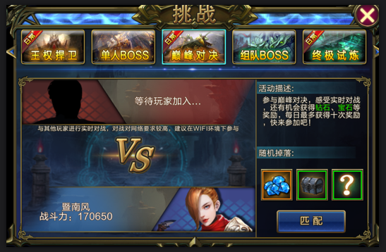 参与方法:在主界面,挑战界面,点击巅峰对决参与,选择平匹配之后进入等待倒计时,点击取消则停止匹配。
