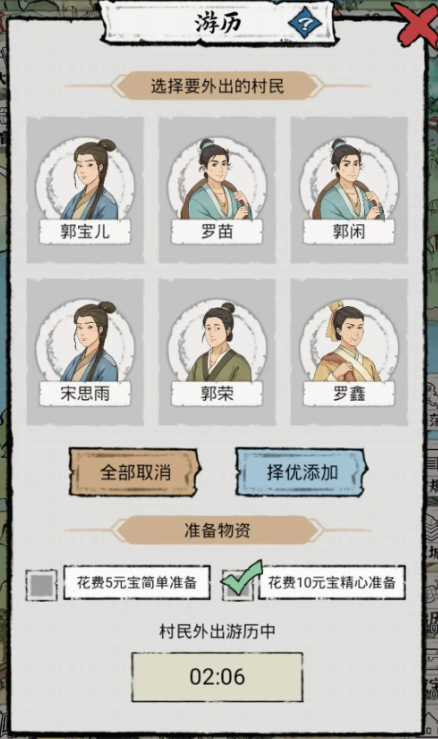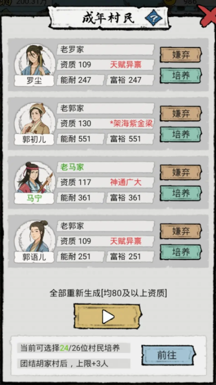 1、选择:开局时选择成年村民,仅需关注其资质,通常选择资质在110以上的角色,有时间的可以刷到120以上,尽量选择高资质的角色,这将为后续的培养节省大量精力。