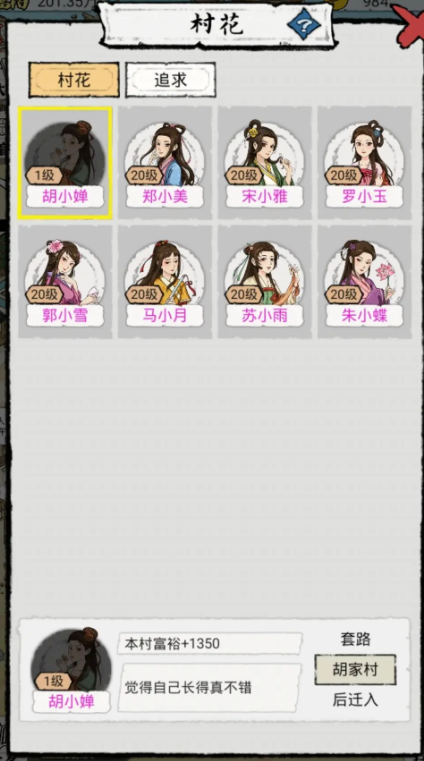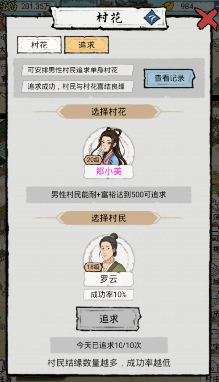 四:村花村草:目前我已将人物等级全部点满,追求方面我也不是特别擅长,成功率仅为10%,大部分追求都以失败告终,仅成功过两次,失败后则选择撮合,我通常选择花费金元宝的方式,而撮合对象最好选择紫色及以上,这样增加的能力更高,绿色和蓝色的则建议放弃,毕竟每次撮合后成功率会降低。