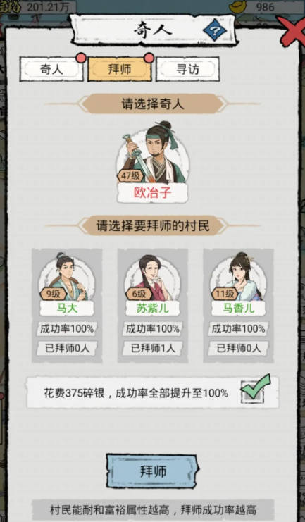拜师一栏我会选择一个师傅,三个徒弟,徒弟选择成功率50%的,这样能减少银元宝的消耗。