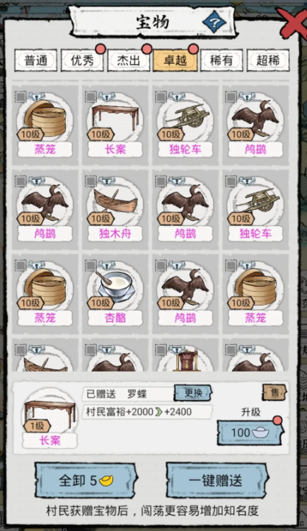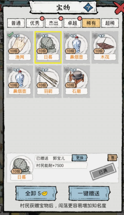 宝物无需急于升满,需注意的是这些宝物在进京时会被带走,包括宝物的加成,我们所依赖的正是宝物的特别加成,例如耕地+5经验,这对我们的升级十分有益,因此无需过于着急地提升等级,适度升级以满足过关要求。